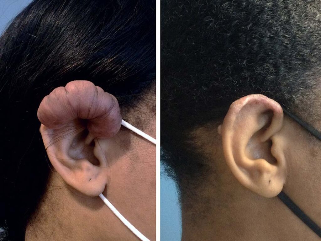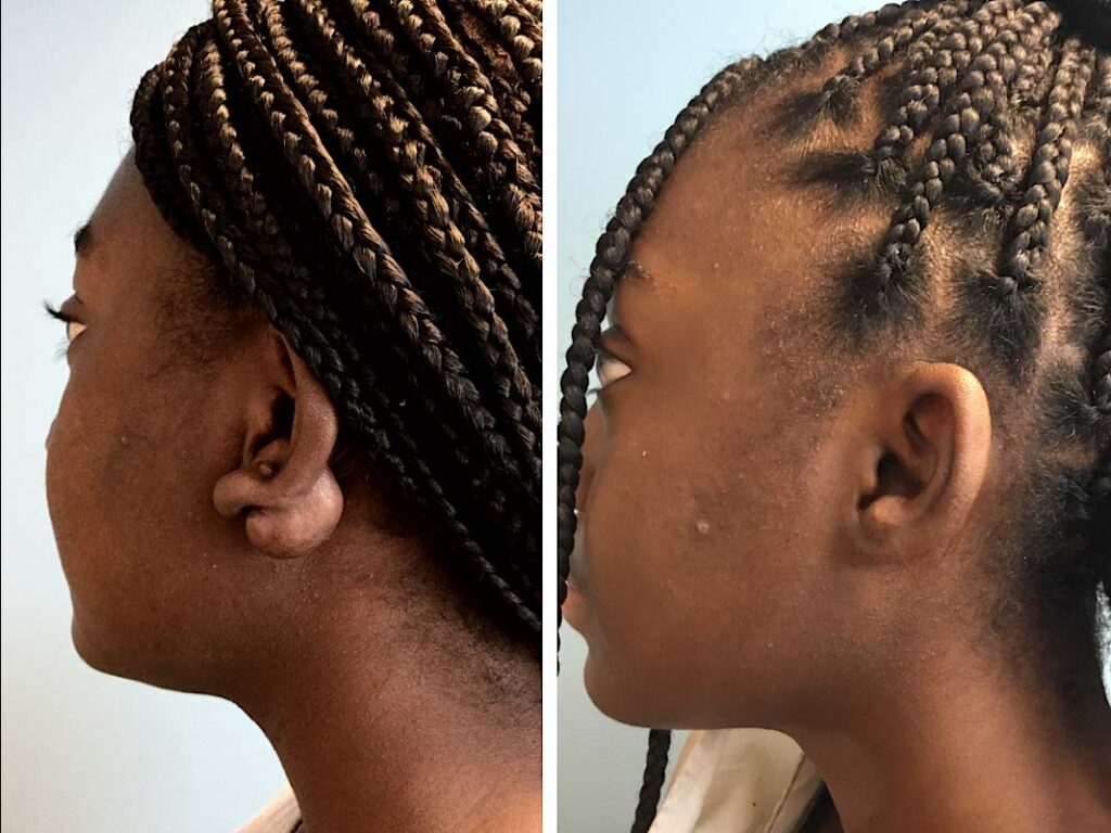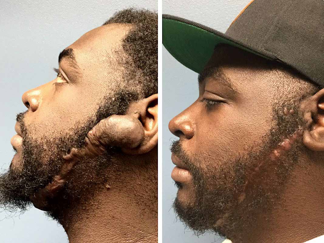 The keloids not only affected his self-esteem, but also his daily life. Keenan struggled with discomfort, often unable to sleep, and carried a towel to manage the blood and pus they would sometimes ooze. In 2015, he appeared on The Doctors to share his story, and Reconstructive Plastic Surgeon Dr. Michael Jones volunteered to help. Dr. Jones performed two surgeries to remove the keloids, one on each side of Keenan’s face. The procedure was more complex than expected, with the keloids embedded in a thick sheet of scar tissue, putting Keenan’s facial nerves at risk. But after the surgery, Dr. Jones was able to tell Madeline, “Everything went great! The keloids are gone.”