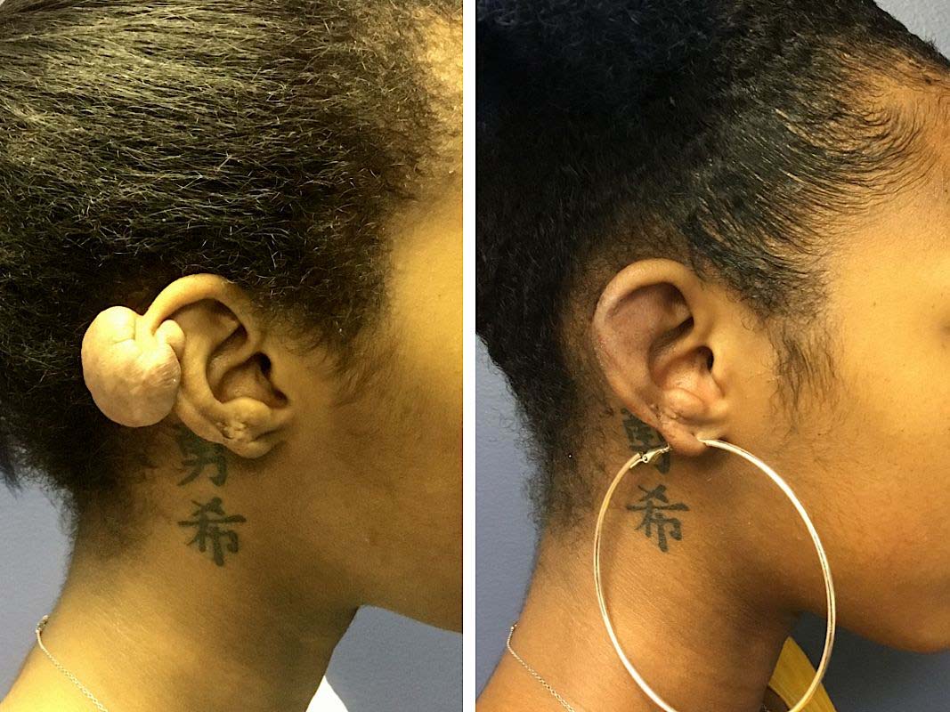 It all started with a childhood case of chicken pox, recalls Keenan’s mother, Madeline. A small keloid scar was left behind, which a doctor removed—only for the scar to return, larger and more spread out. “Each time they were removed, they came back even bigger and more grotesque,” Keenan says.